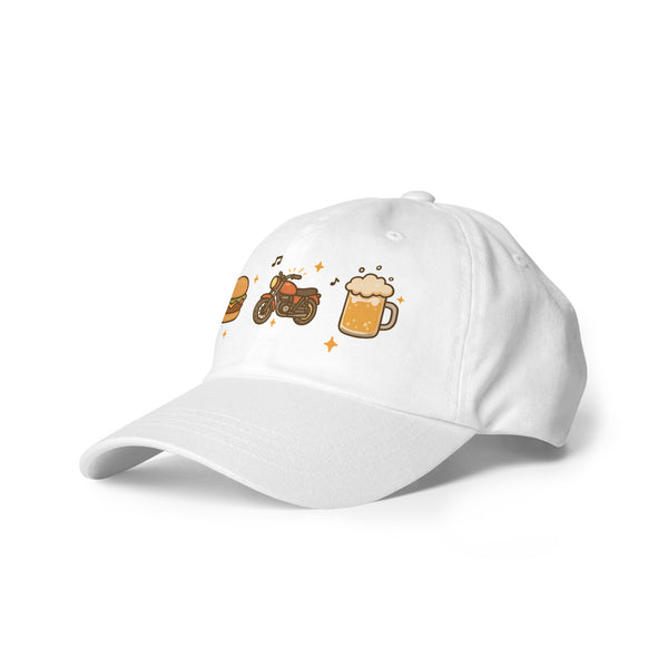 Ready for good vibes and great times? This festival-inspired dad hat brings the spirit of summer with a cute, hand-drawn illustration celebrating life’s essentials: burgers, bikes, and beer. Perfect for music festivals, food truck rallies, and laid-back weekends. Just add sunshine (and maybe a cold one).