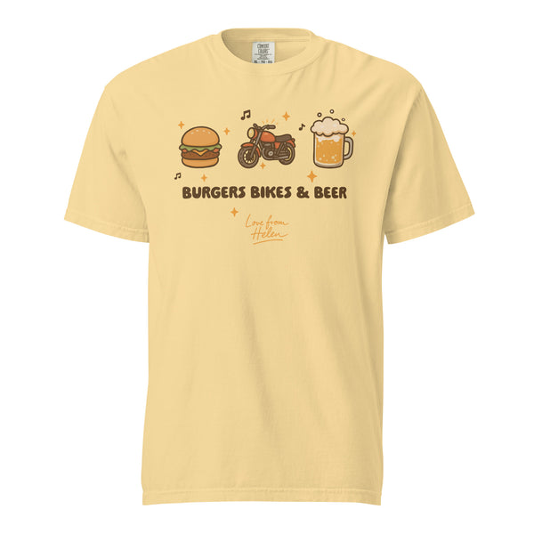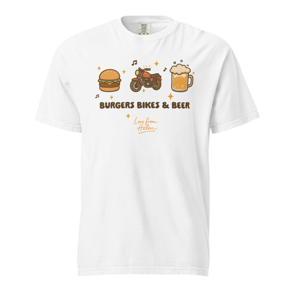 Ready for good vibes and great times? This festival-inspired tee brings the spirit of summer with a cute, hand-drawn illustration celebrating life’s essentials: burgers, bikes, and beer. Perfect for music festivals, food truck rallies, and laid-back weekends. Super comfy and available in a rainbow of colours to match your mood — just add sunshine (and maybe a cold one).