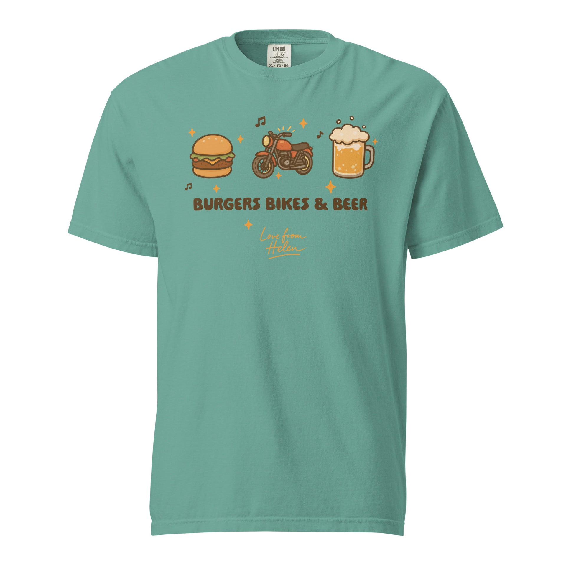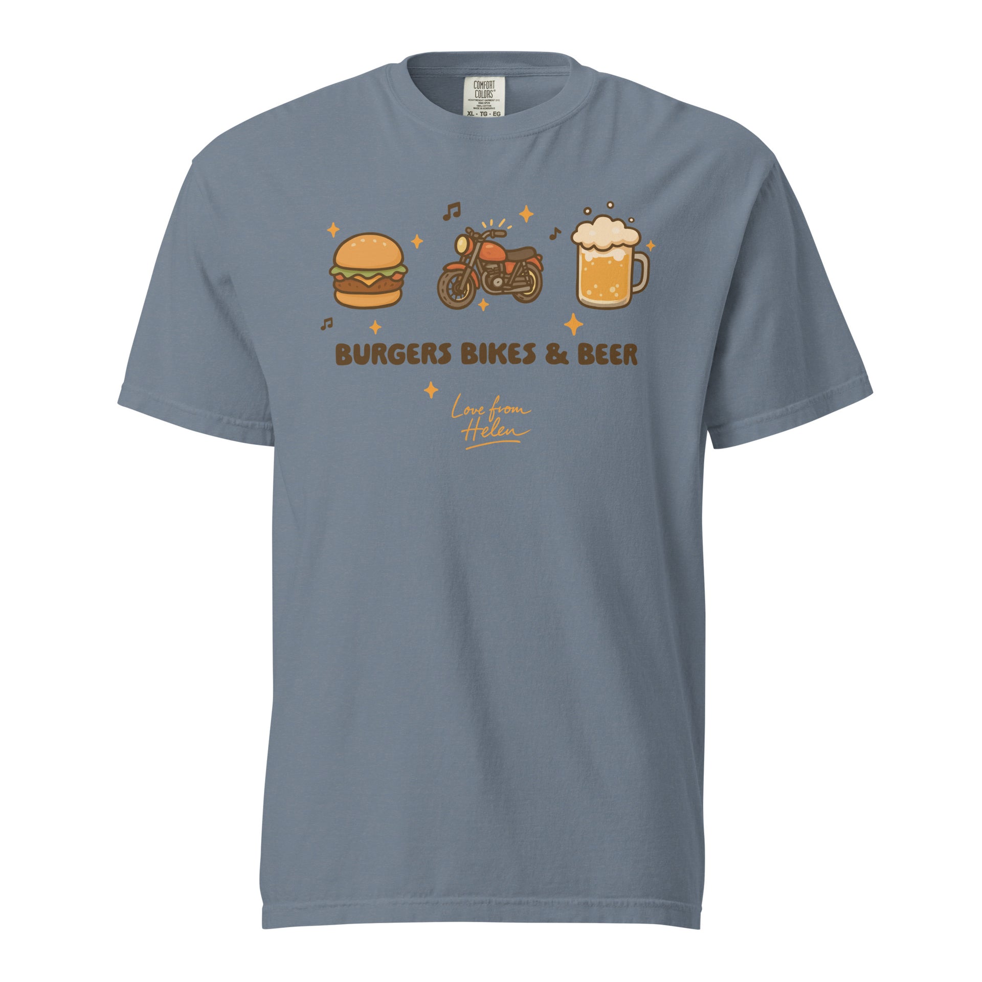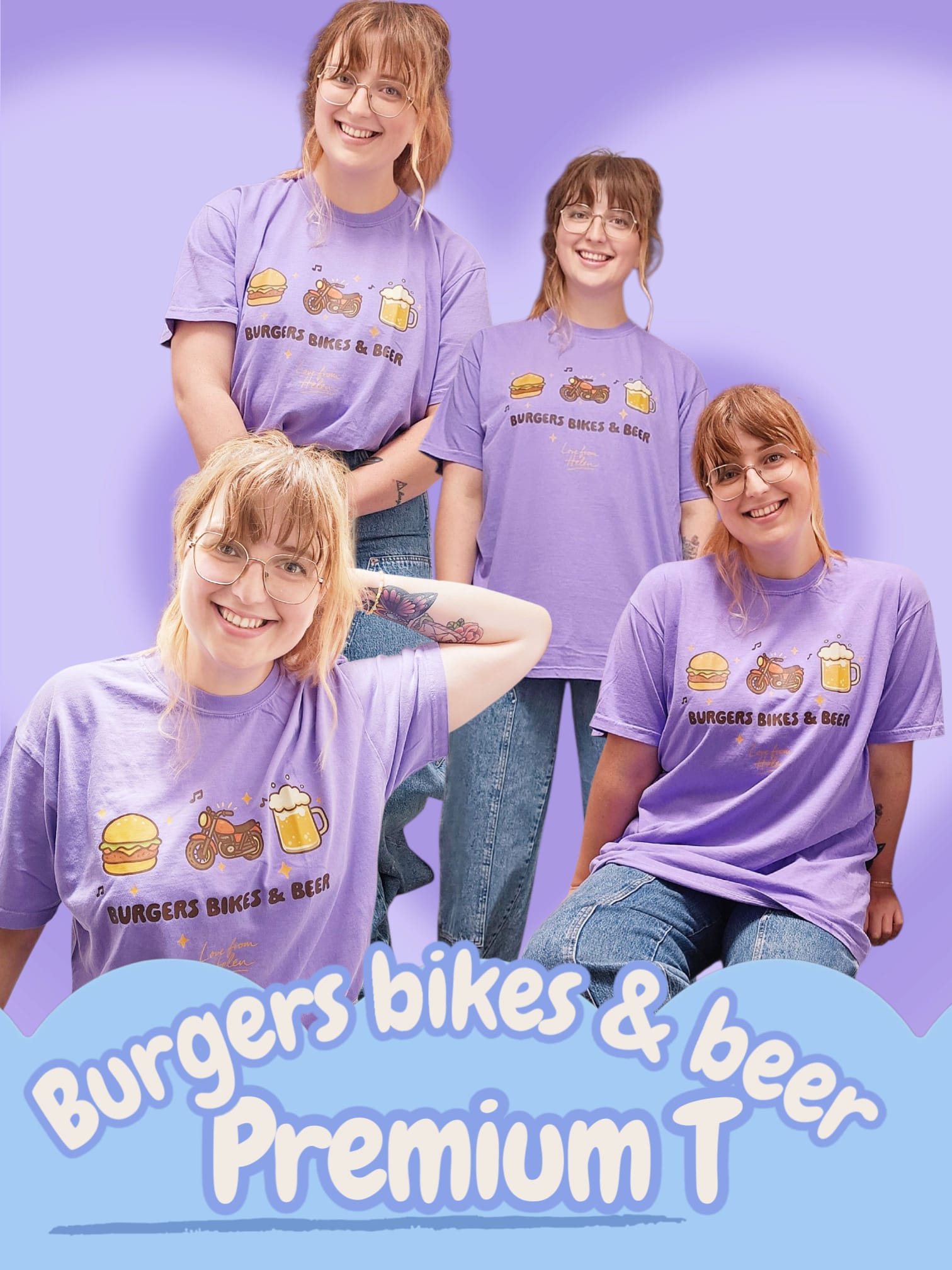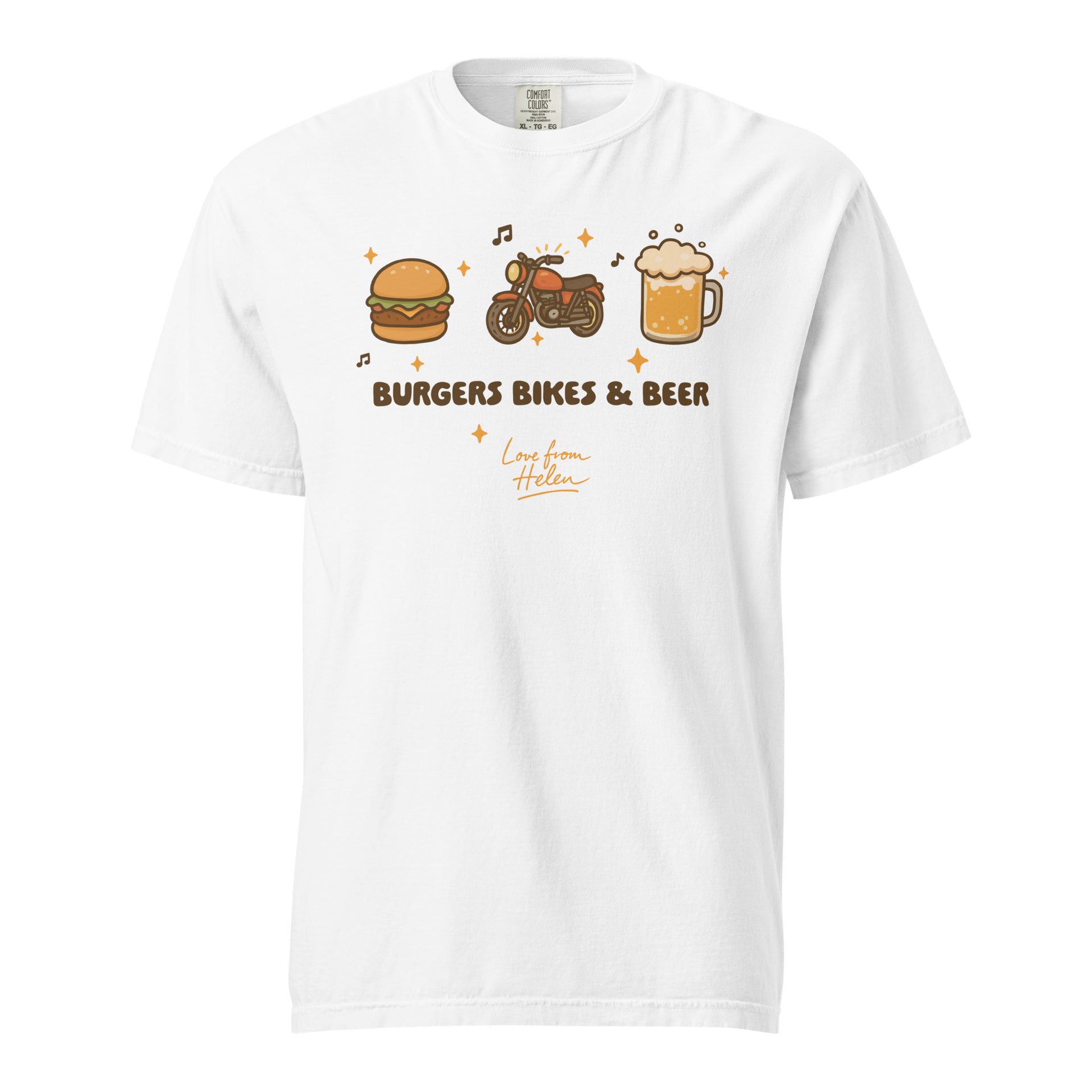 Ready for good vibes and great times? This festival-inspired tee brings the spirit of summer with a cute, hand-drawn illustration celebrating life’s essentials: burgers, bikes, and beer. Perfect for music festivals, food truck rallies, and laid-back weekends. Super comfy and available in a rainbow of colours to match your mood — just add sunshine (and maybe a cold one).